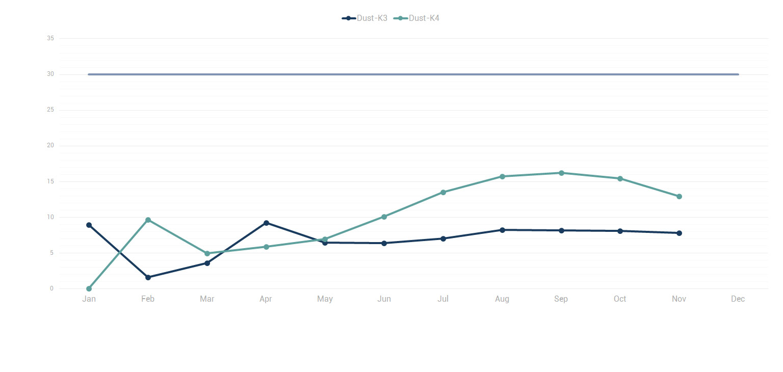 The average monthly values of dust emissions in the current year of 2023 and the past year of 2022 which are far below the limit value of 30 mg/Nm³ are shown in the following charts: