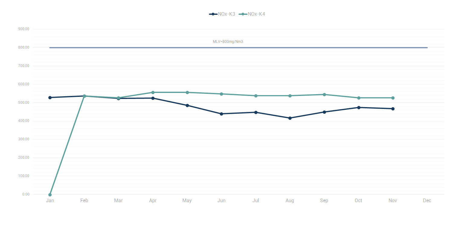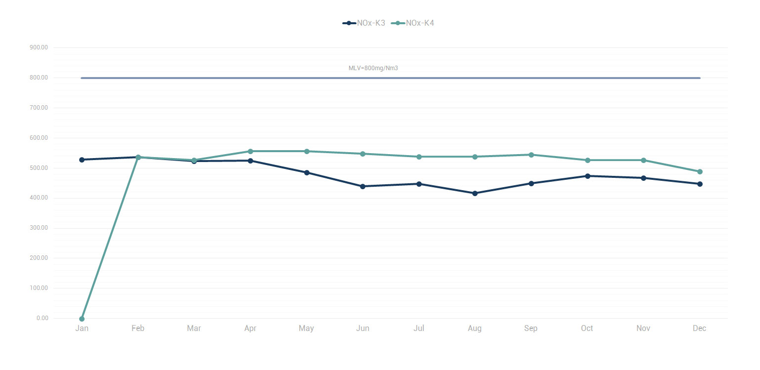 Here you can find data on the average monthly values of NOx emissions in the current year of 2023 and the past year of 2022, which are below the limit value of 800 mg/Nm³: