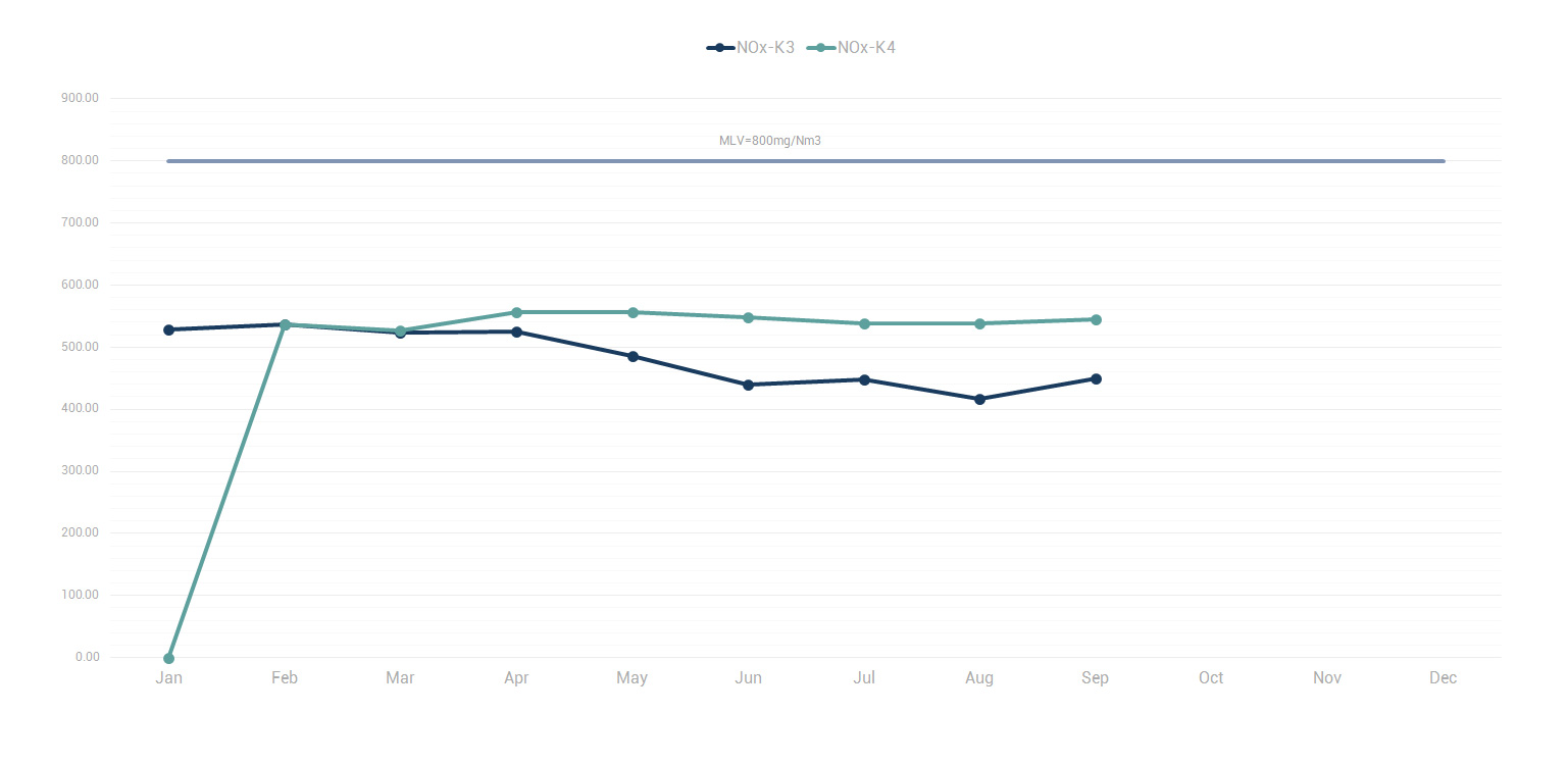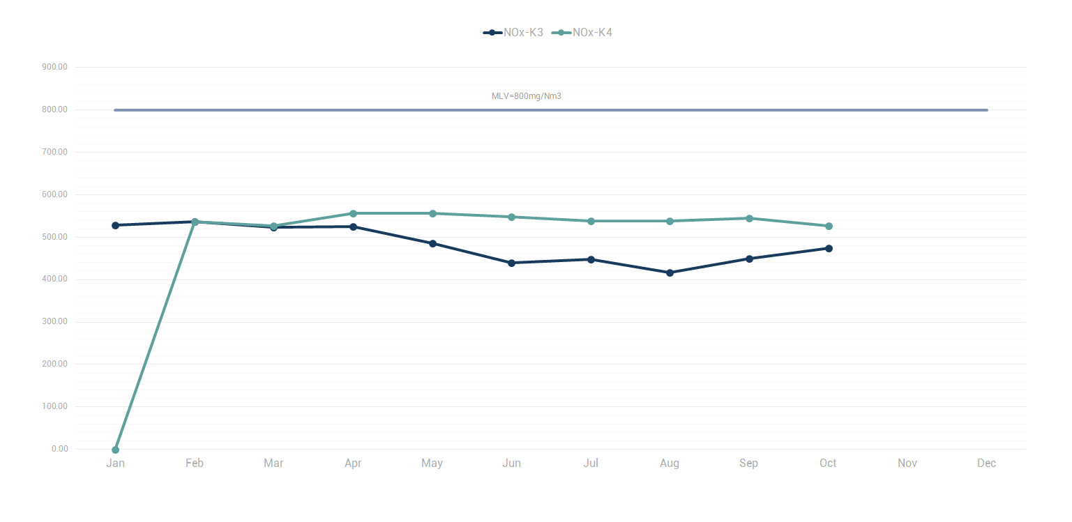 Овде можете да ги најдете податоците за просечните месечни вредности на емисии на NOx во тековната 2023 и во изминатата 2022 година кои се значајно под дозволената вредност од 800 mg/Nm³: