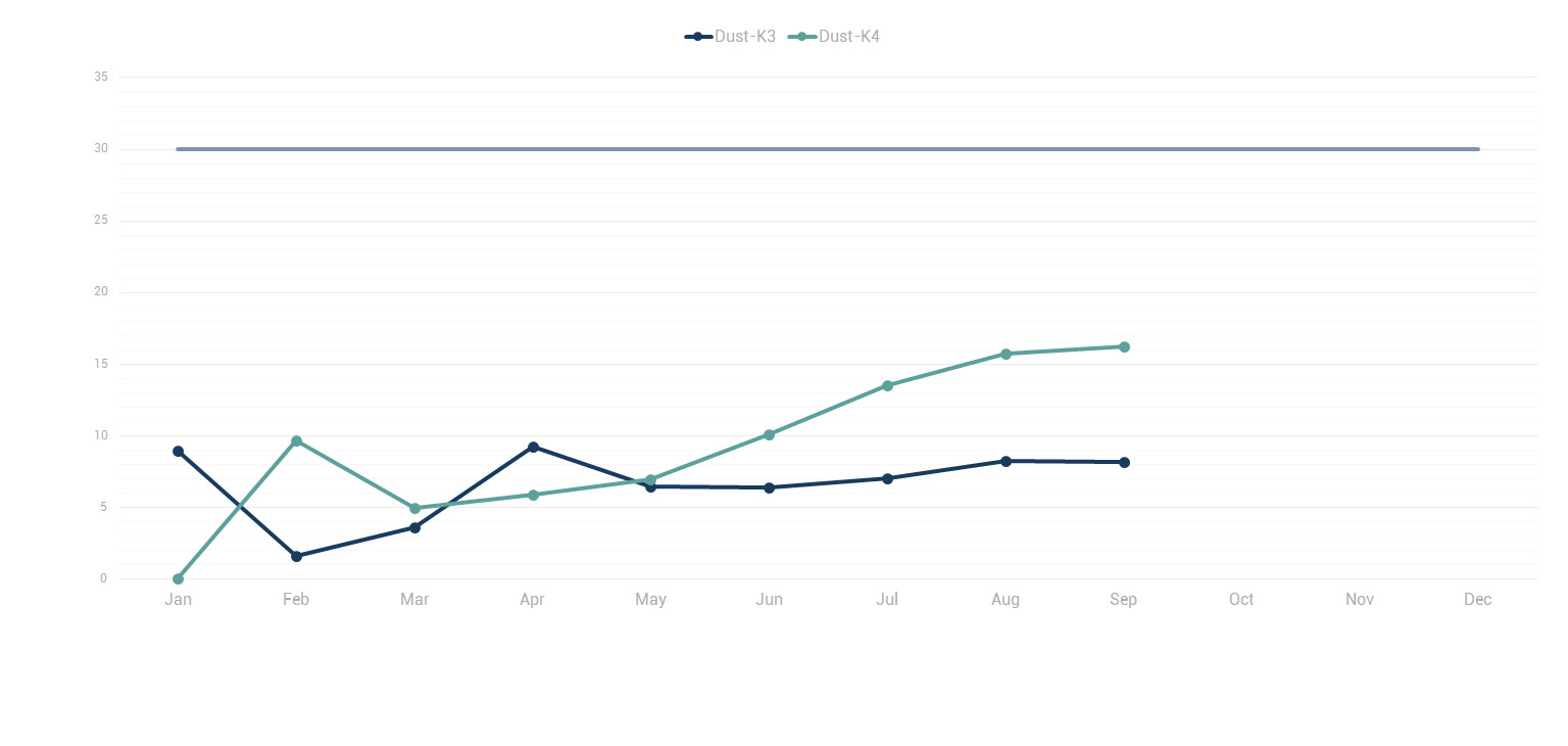 Просечните месечни вредности на емисии на прашина во тековната 2023 и во изминатата 2022 година кои се значајно под дозволената вредност од 30 mg/Nm³ се прикажани на следните графикони: